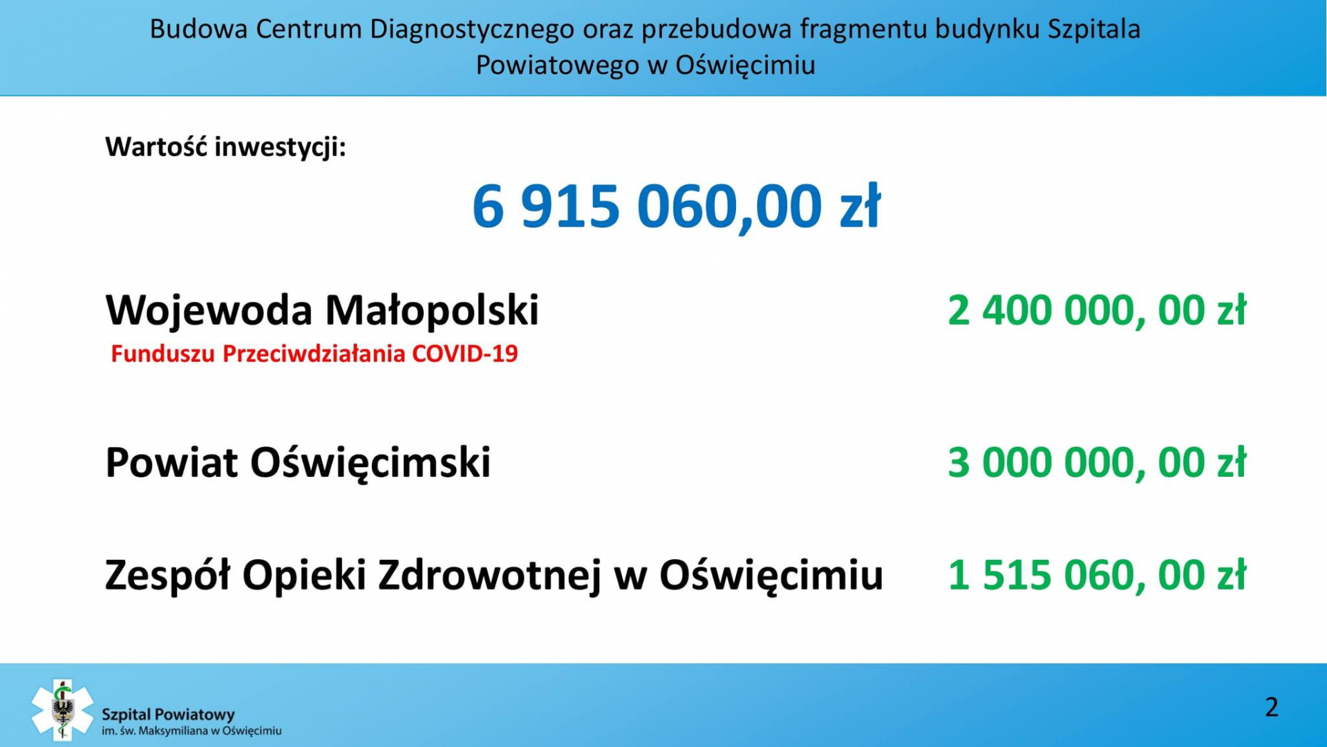 Szpital Powiatowy w Oświęcimiu realizuje dużą inwestycję budowlaną przy wsparciu środków z Funduszu Przeciwdziałania COVID-19 .Zadanie pn. „Budowa Centrum Diagnostycznego oraz przebudowa fragmentu budynku Szpitala Powiatowego w Oświęcimiu – w związku z COVID-19” – otrzymało dofinansowanie w wysokości 2,4 mln zł ze strony Wojewody Małopolskiego.Powiat Oświęcimski dofinansował inwestycję w wysokości 3,0 mln zł.
